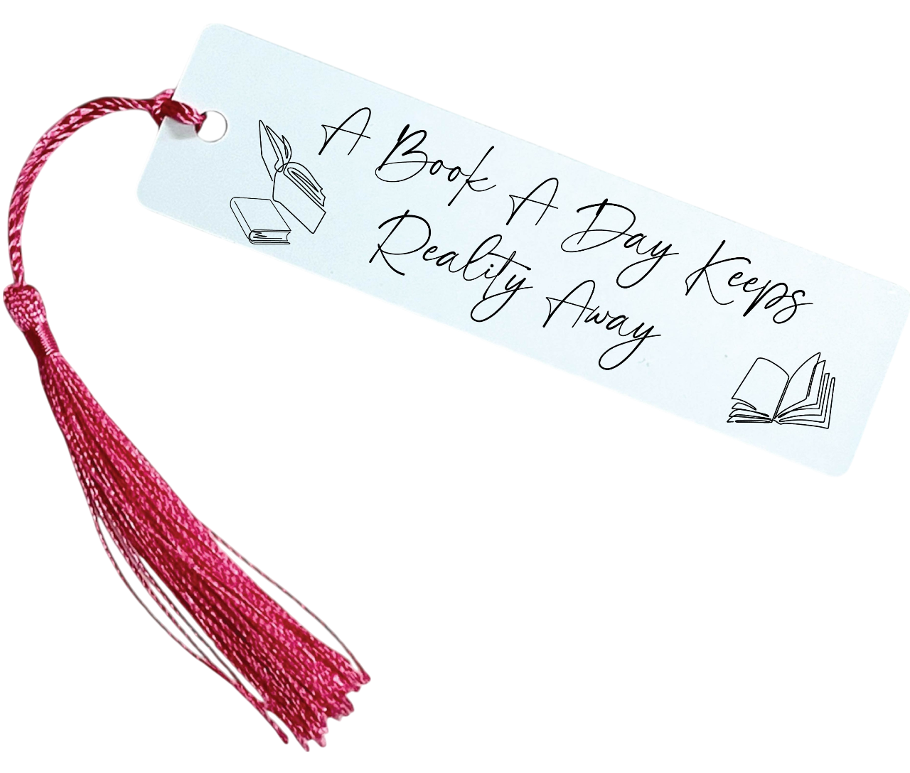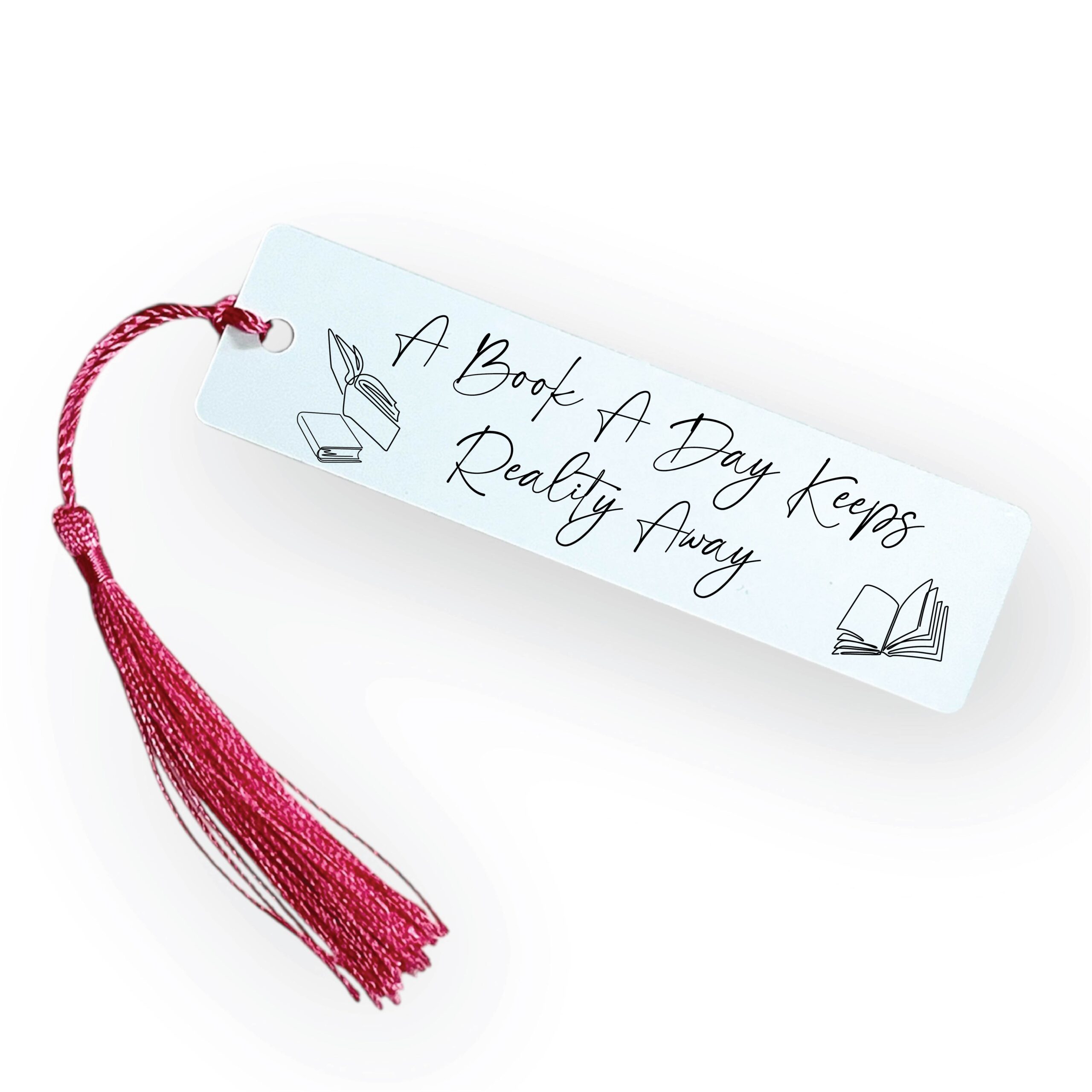 Escape into your next great read with the “A Book a Day Keeps Reality Away” bookmark — a must-have for every daydreaming book lover. Designed with a crisp white background and bold black lettering, this stylish bookmark is topped with a vibrant hot pink tassel for a fun, eye-catching finish.