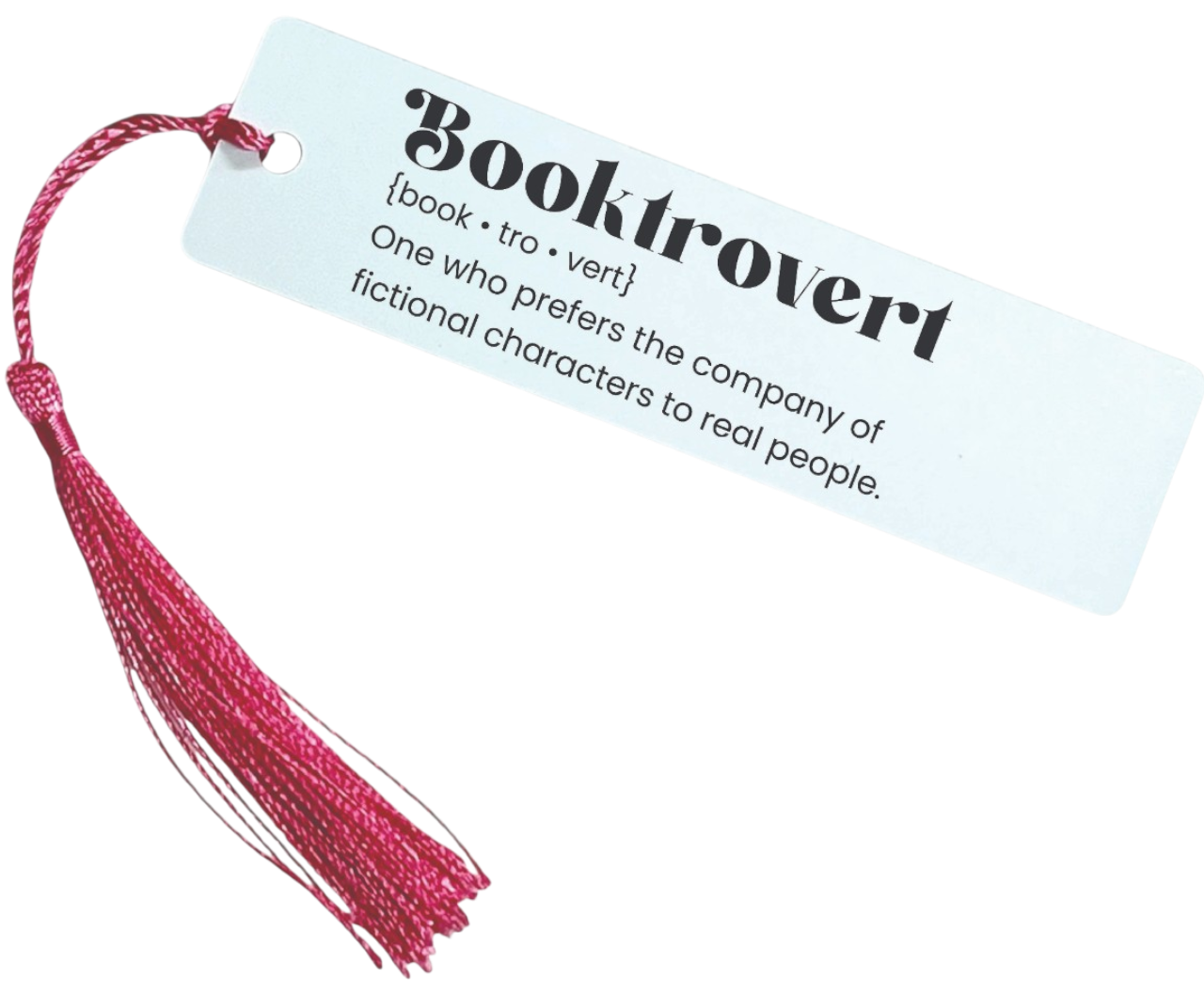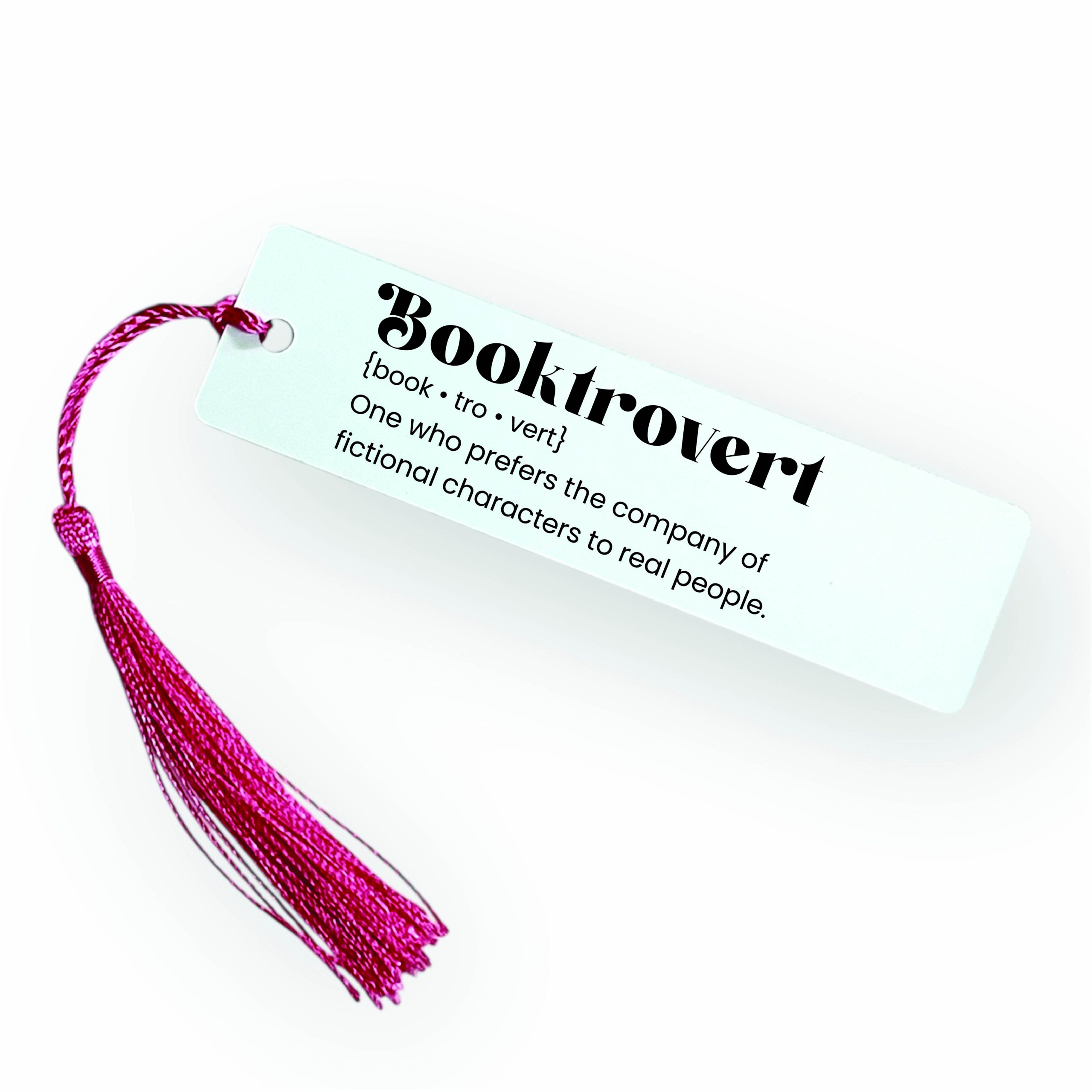 For the readers who’d rather be lost in a book than making small talk — the “Booktrovert” Bookmark is made just for you. With a sleek white background, bold black text, and a bright hot pink tassel for flair, this bookmark defines the ultimate introverted book lover: “One who prefers the company of fictional characters to real people.”