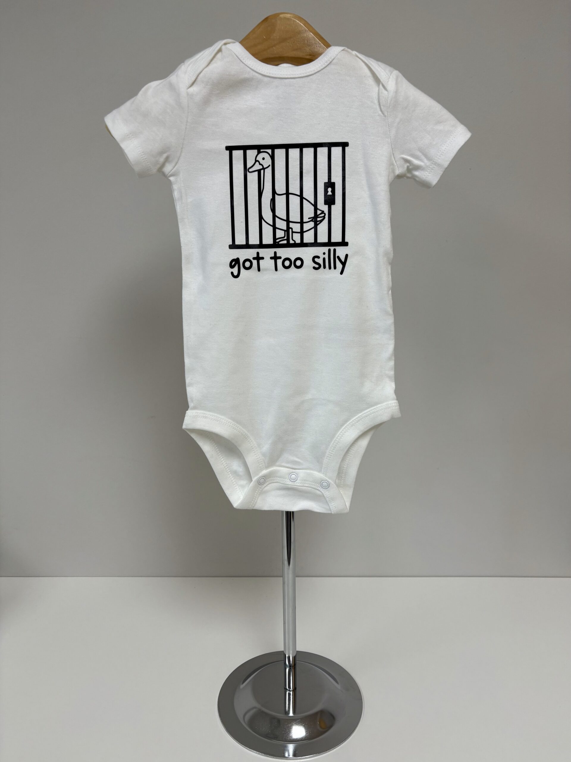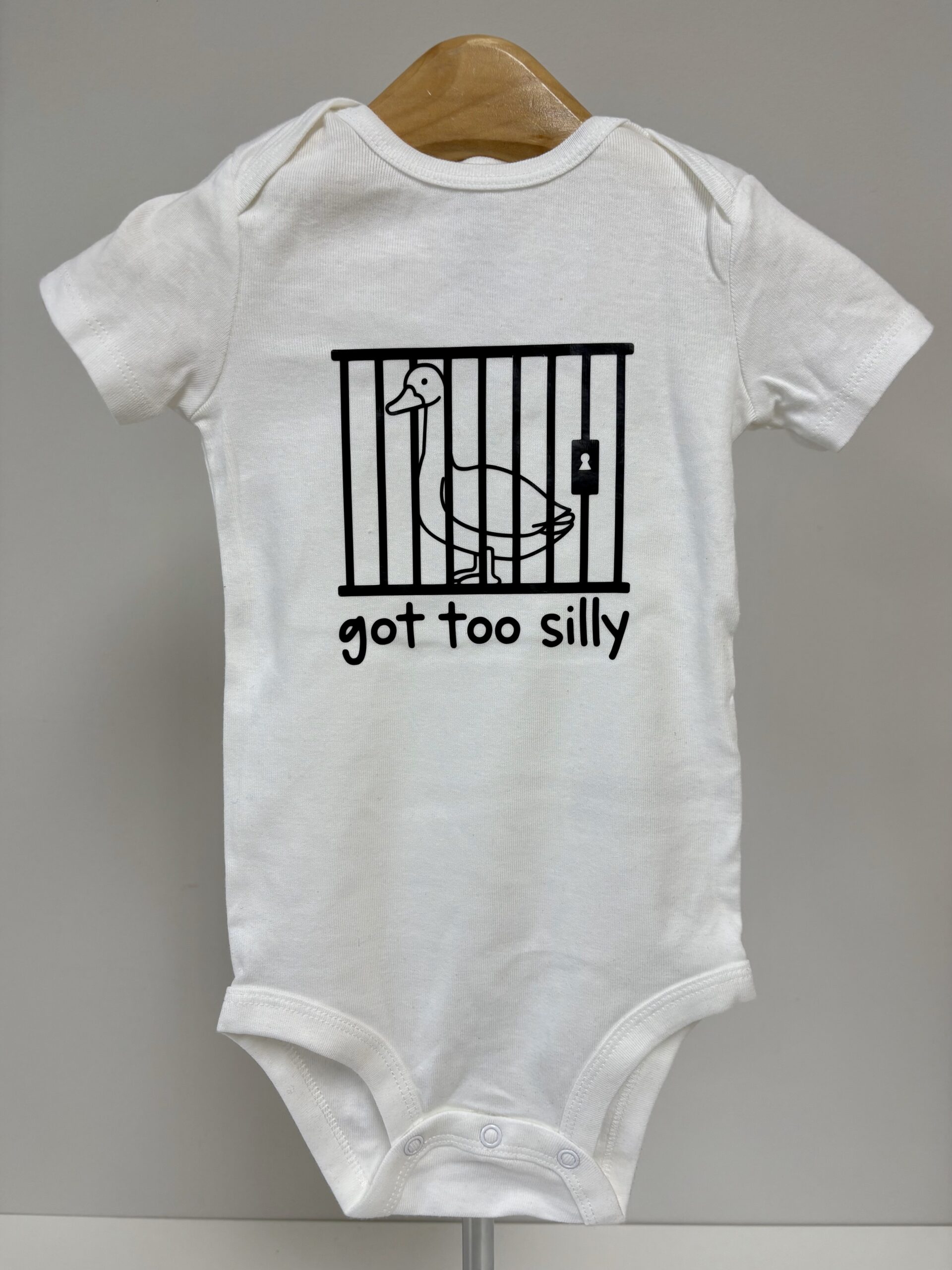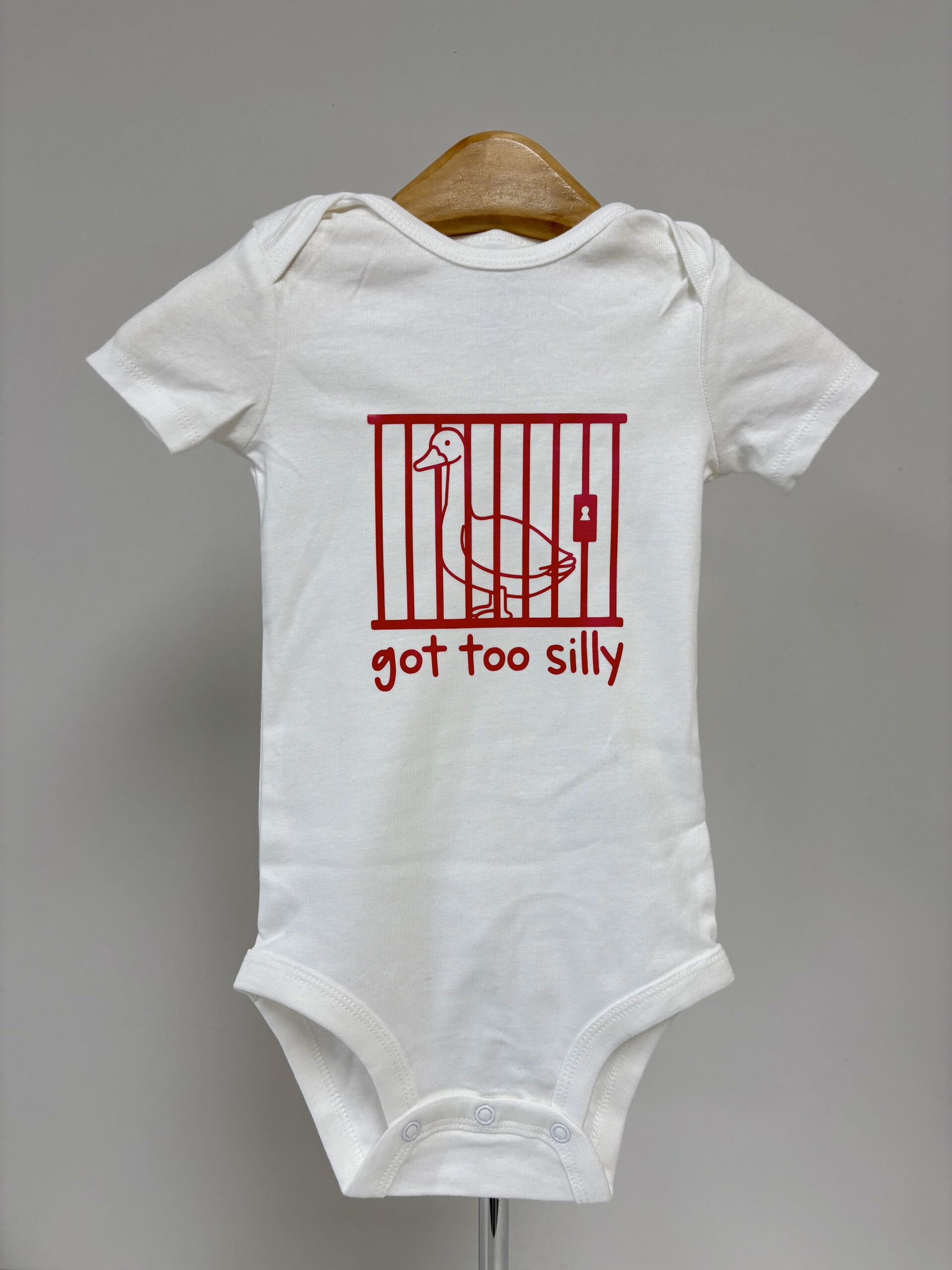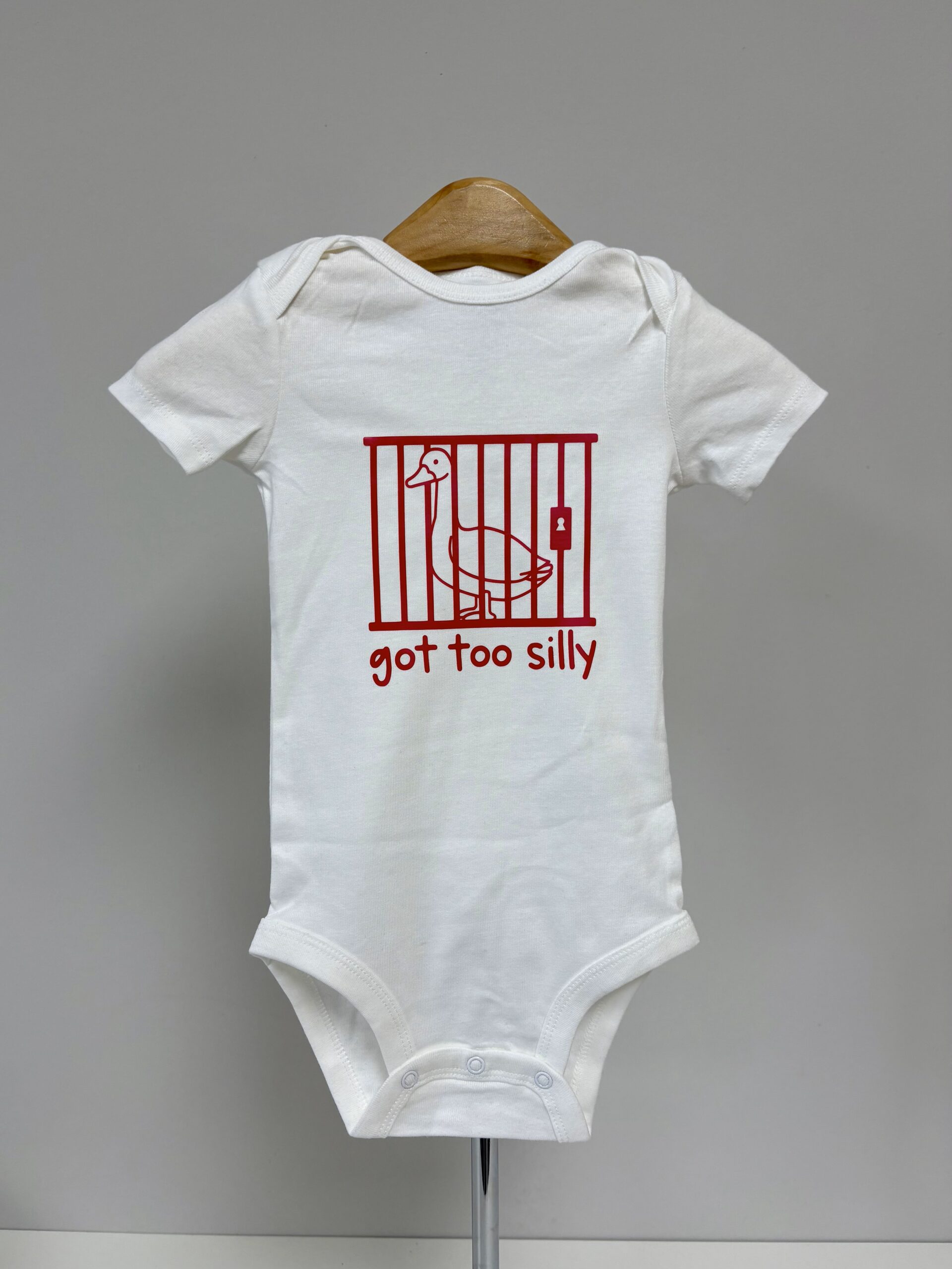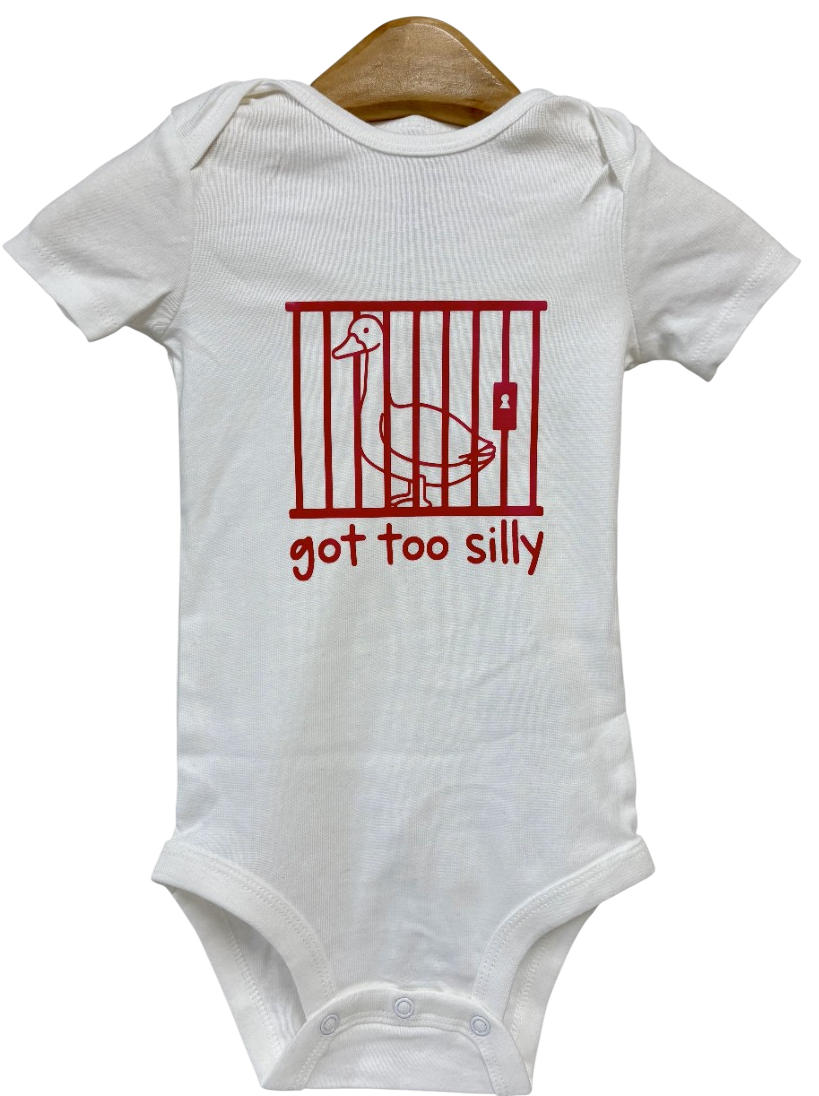 Sometimes the silliness just gets out of hand — and this hilarious onesie says it all! The “Got Too Silly” baby bodysuit features a mischievous goose behind bars, printed in bold red on soft white cotton. Whether it’s for your own little rascal or a funny baby shower gift, this playful piece is perfect for bringing the laughs (and the cuteness) to any day.