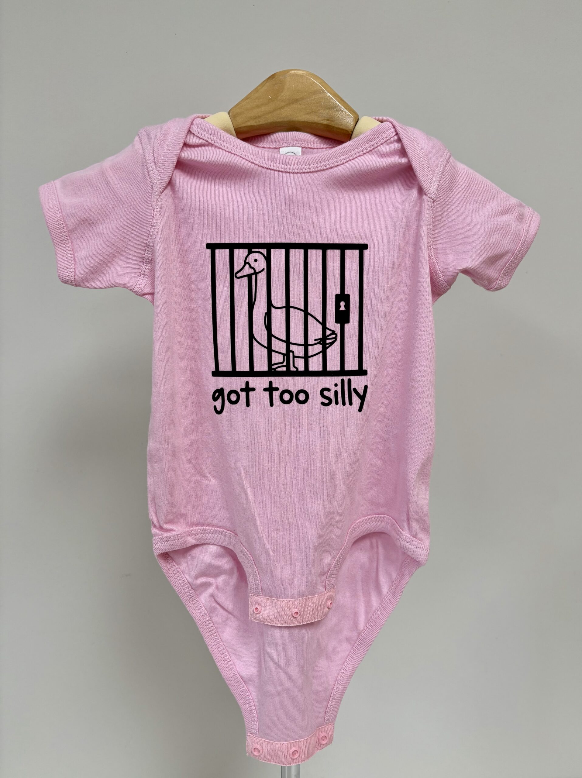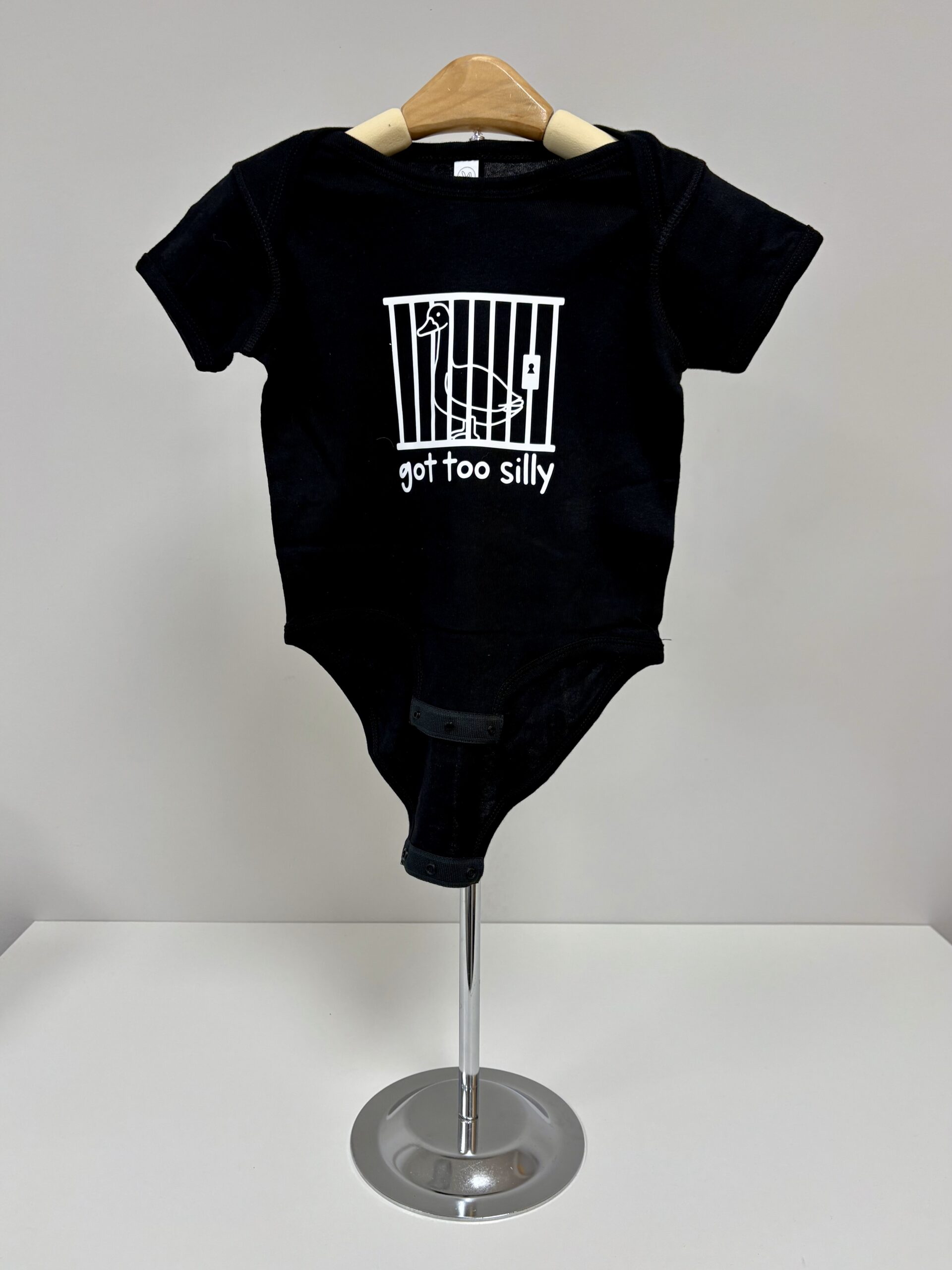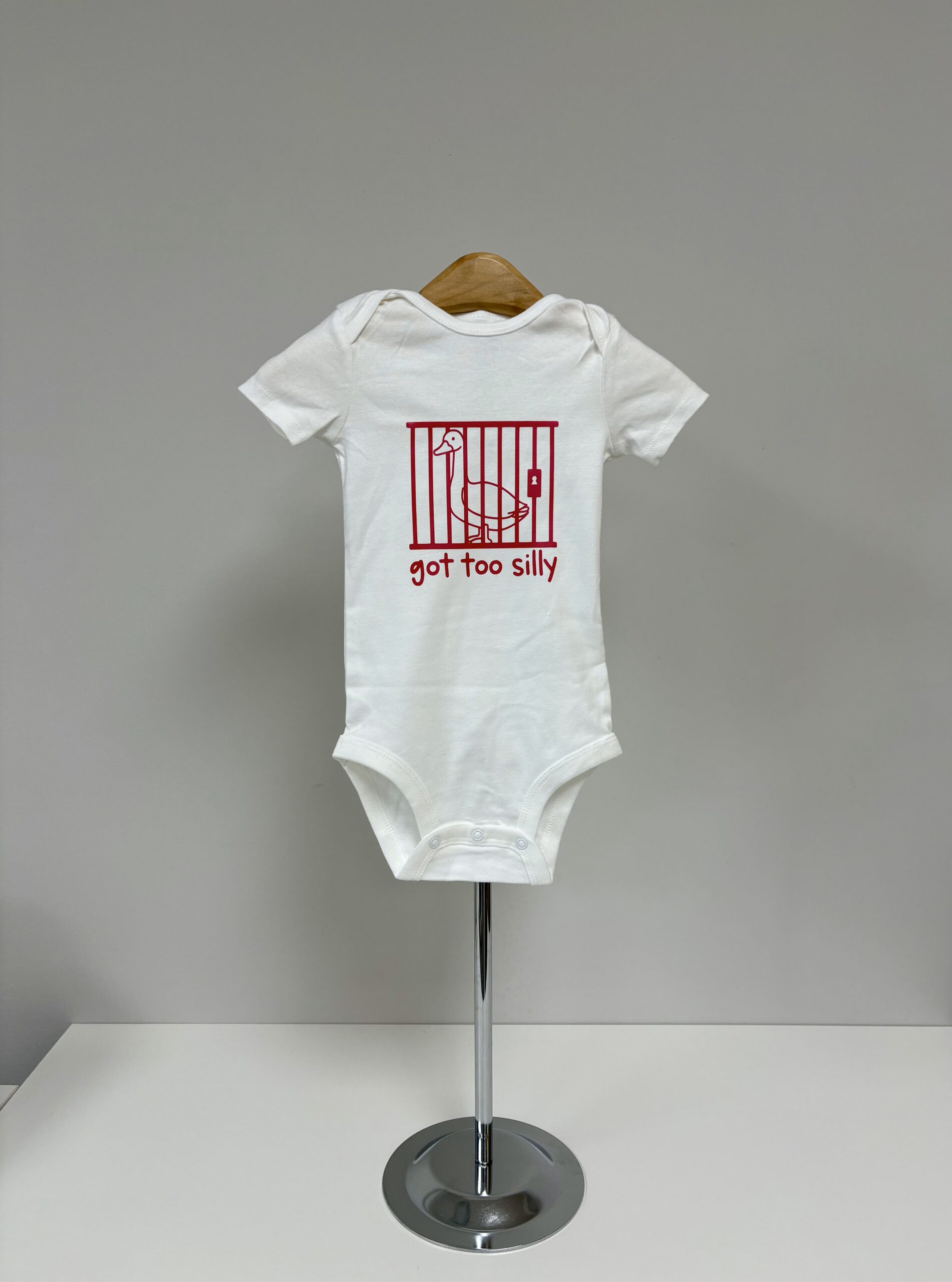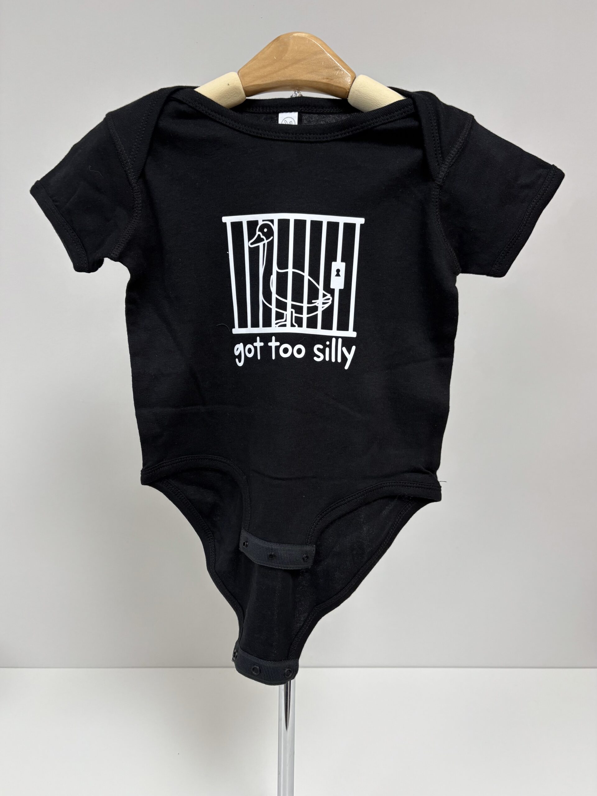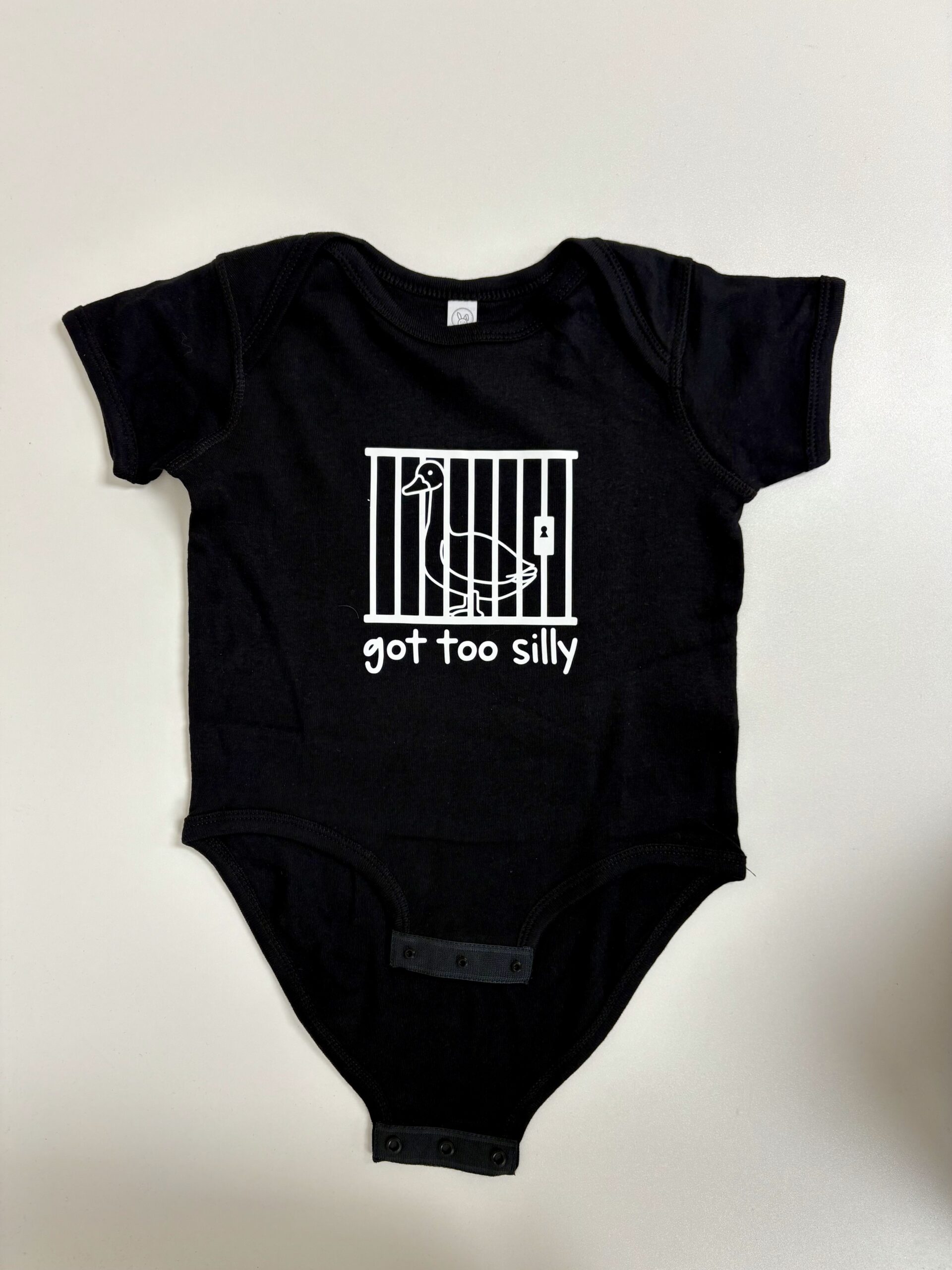 Sometimes the silliness just gets out of hand — and this hilarious onesie says it all! The “Got Too Silly” baby bodysuit features a mischievous goose behind bars, printed in bold red on soft white cotton. Whether it’s for your own little rascal or a funny baby shower gift, this playful piece is perfect for bringing the laughs (and the cuteness) to any day.