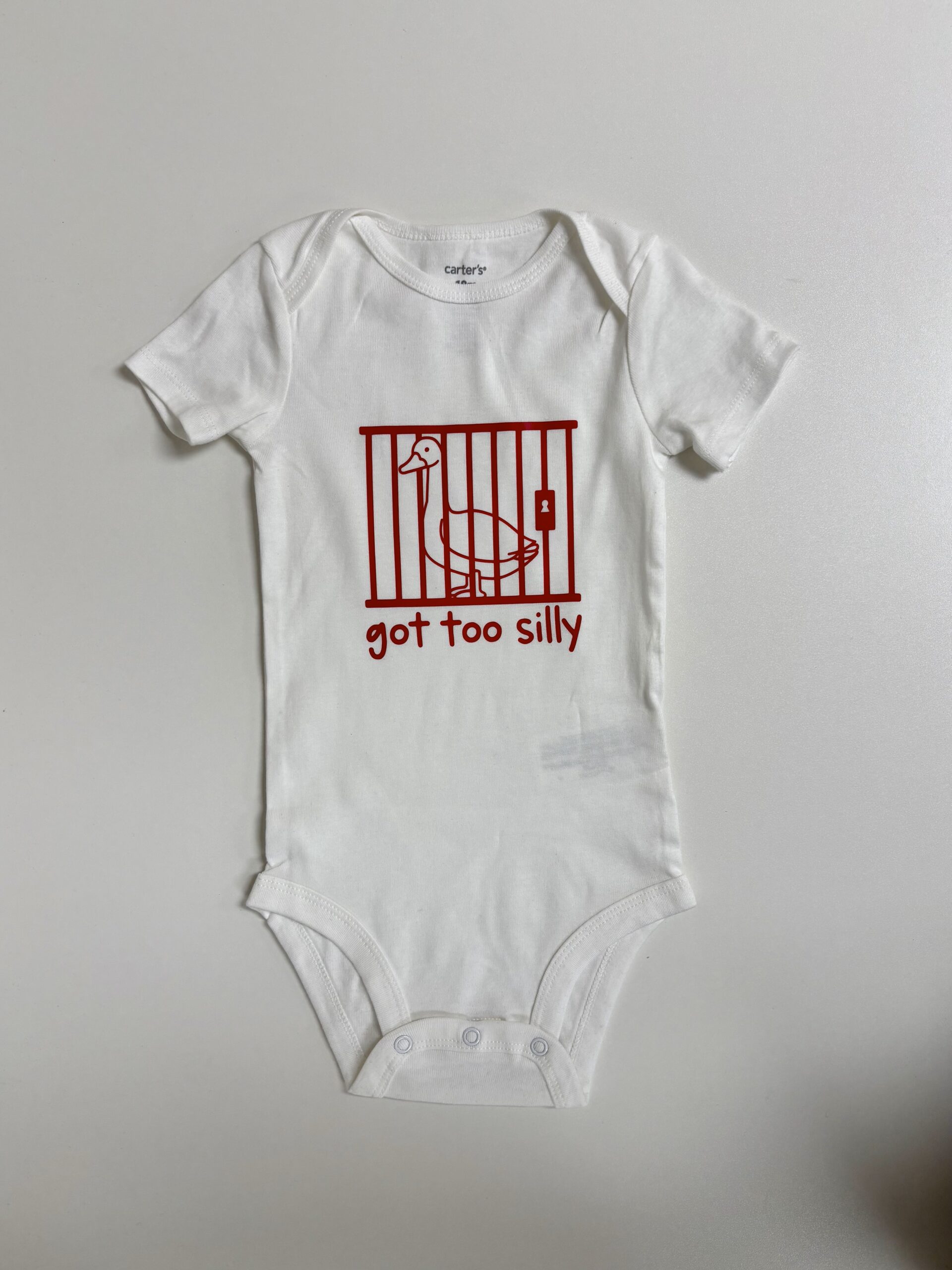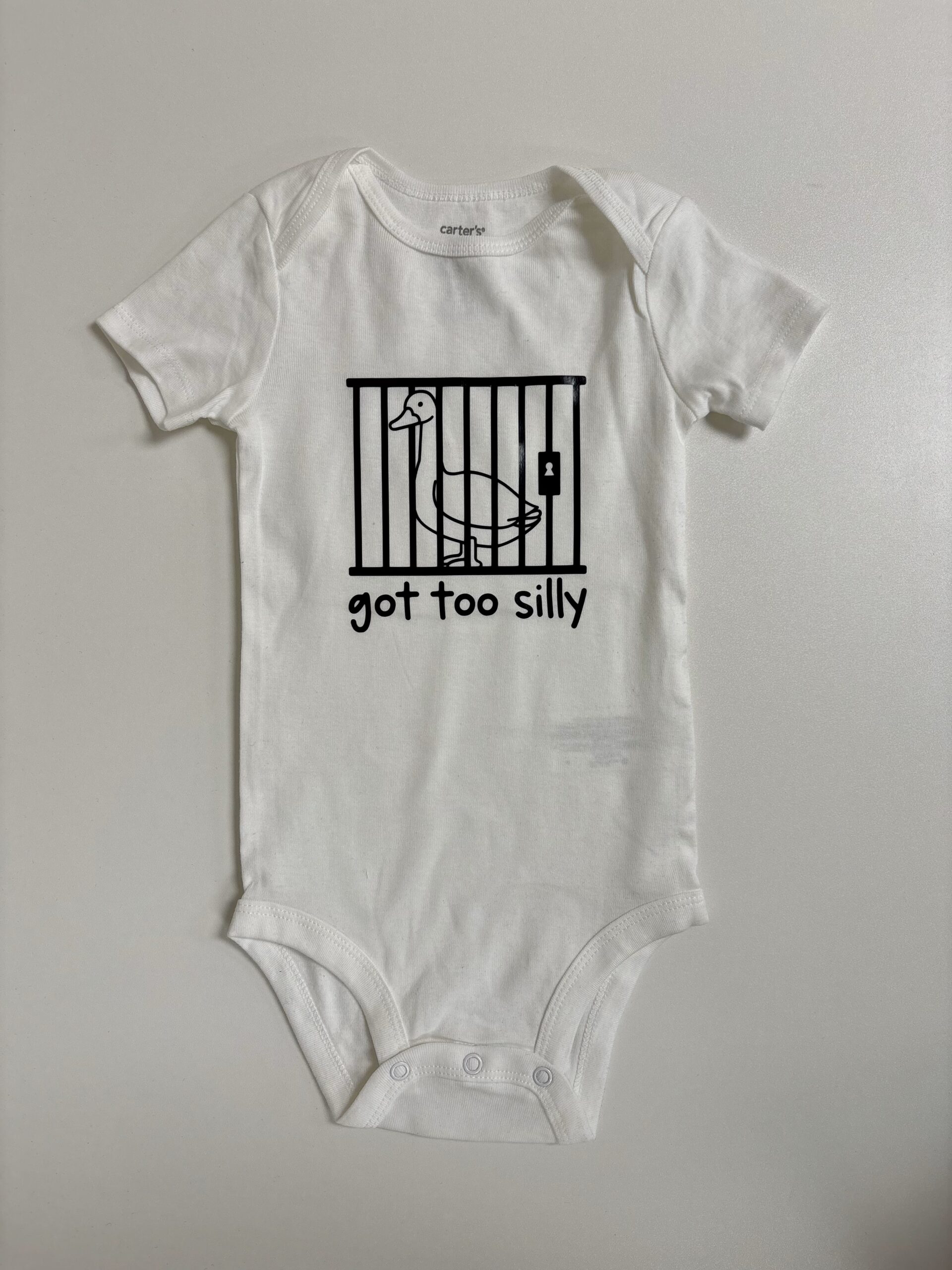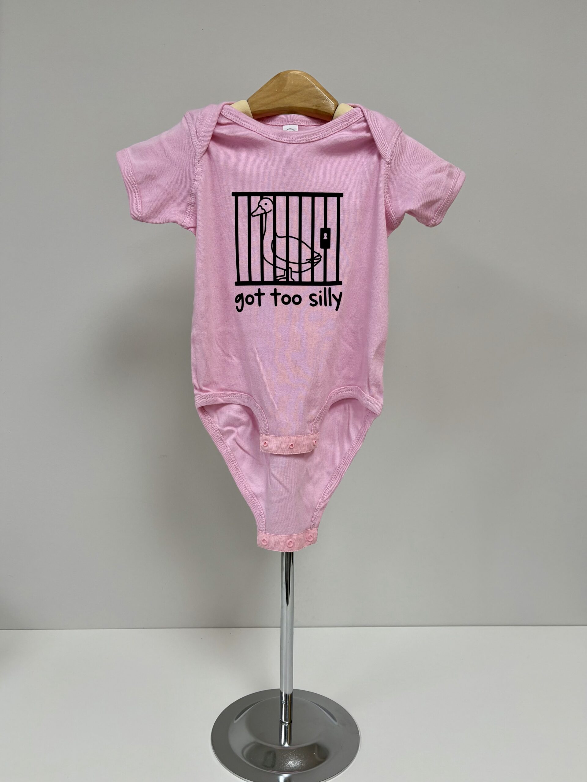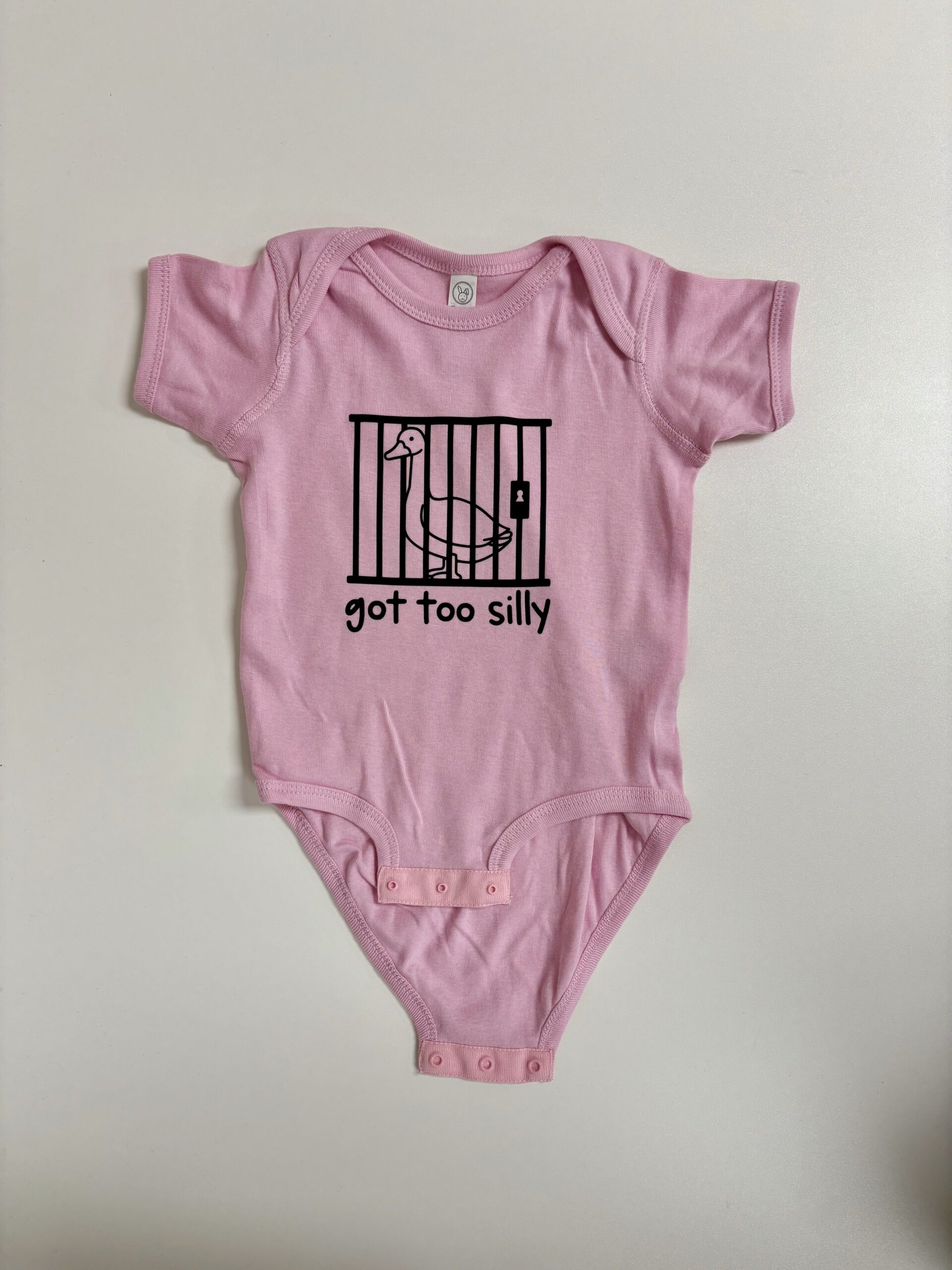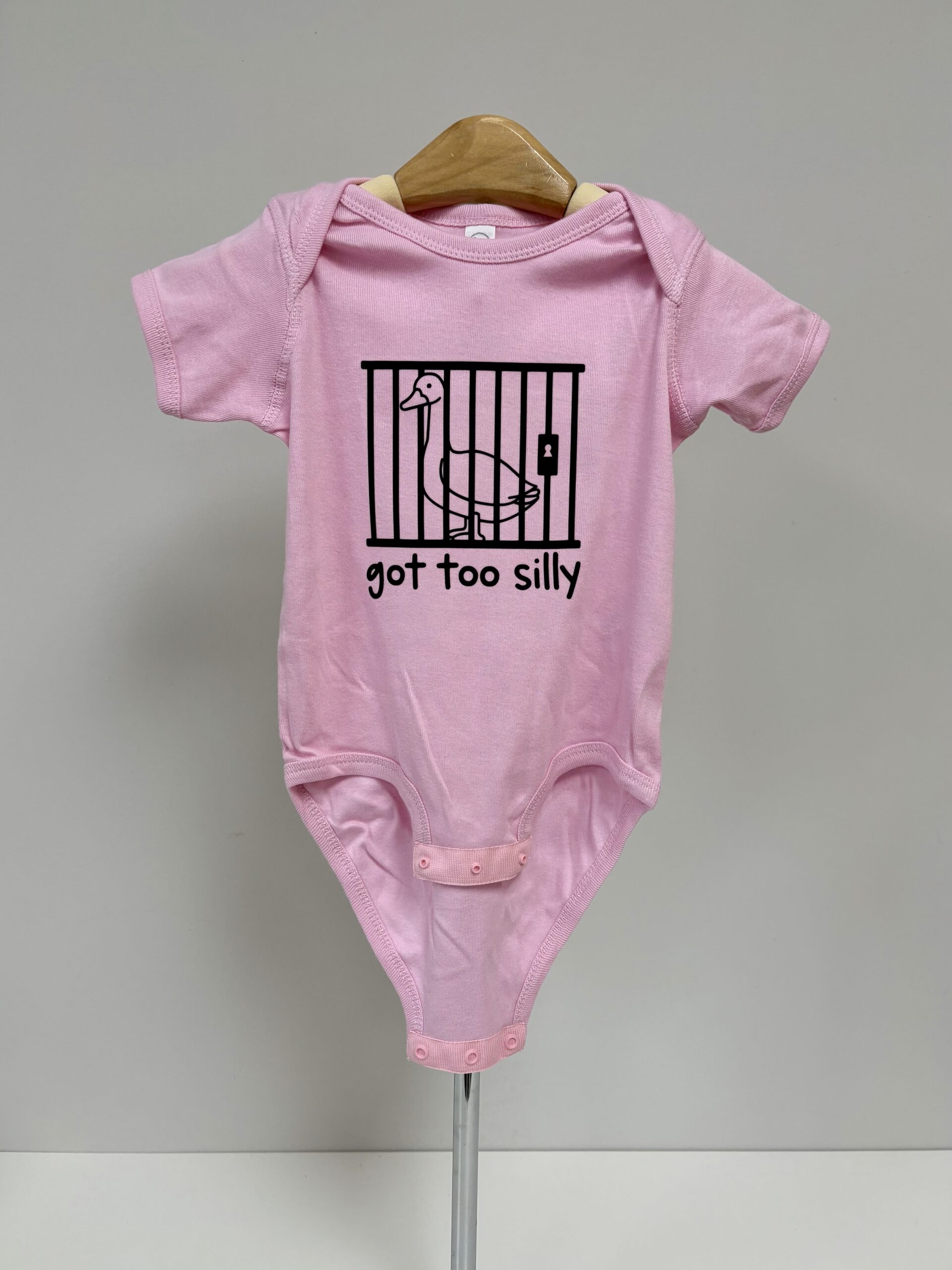 Sometimes the silliness just gets out of hand — and this hilarious onesie says it all! The “Got Too Silly” baby bodysuit features a mischievous goose behind bars, printed in bold red on soft white cotton. Whether it’s for your own little rascal or a funny baby shower gift, this playful piece is perfect for bringing the laughs (and the cuteness) to any day.